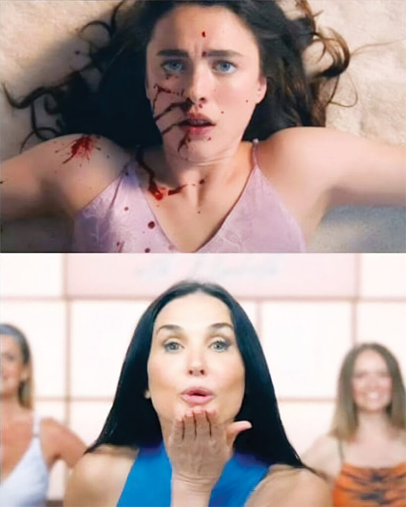 The plot revolves around a mysterious substance that promises its users youth, beauty, and an “improved” version of themselves. The story follows Elizabeth Sparkle (played by Demi Moore), a fading celebrity trying to revive her career and regain relevance. Through the substance, Elizabeth creates a younger version of herself, Sue (played by Margaret Qualley), who soon begins to overshadow her and break the treatment’s rules, which dictate that only one of the two versions can exist at a time and that they must alternate materialization.